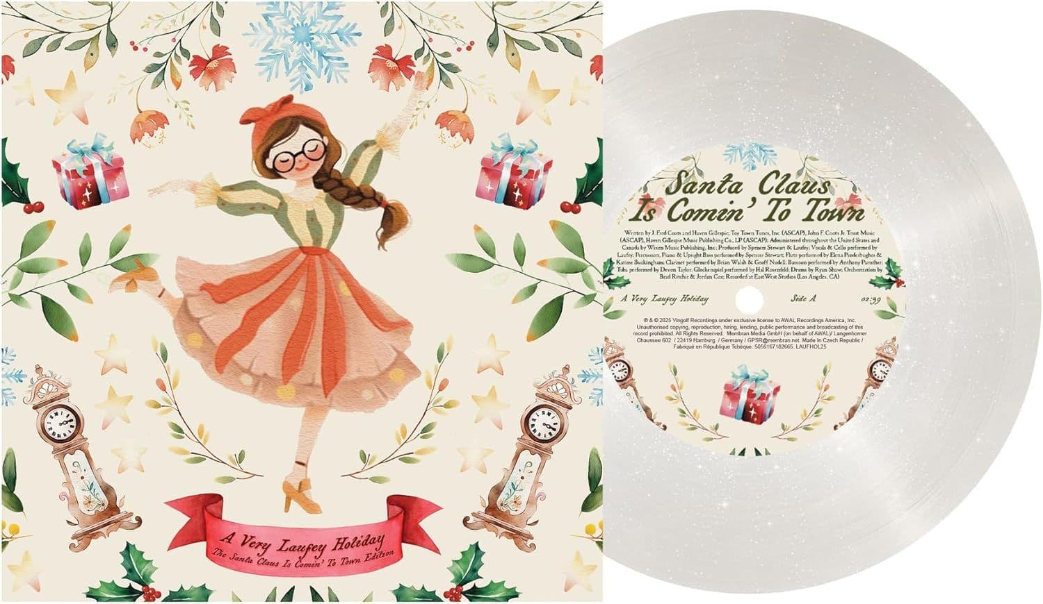 GRAMMY®-winning Icelandic-Chinese artist, composer, producer and multi-instrumentalist Laufey presents the latest vinyl release in her annual series, A Very Laufey Holiday. "The Santa Claus Is Comin' To Town Edition" features a Snow Globe Glitter 7 inch disc with the Christmas classic on side A and "Santa Baby" on Side B